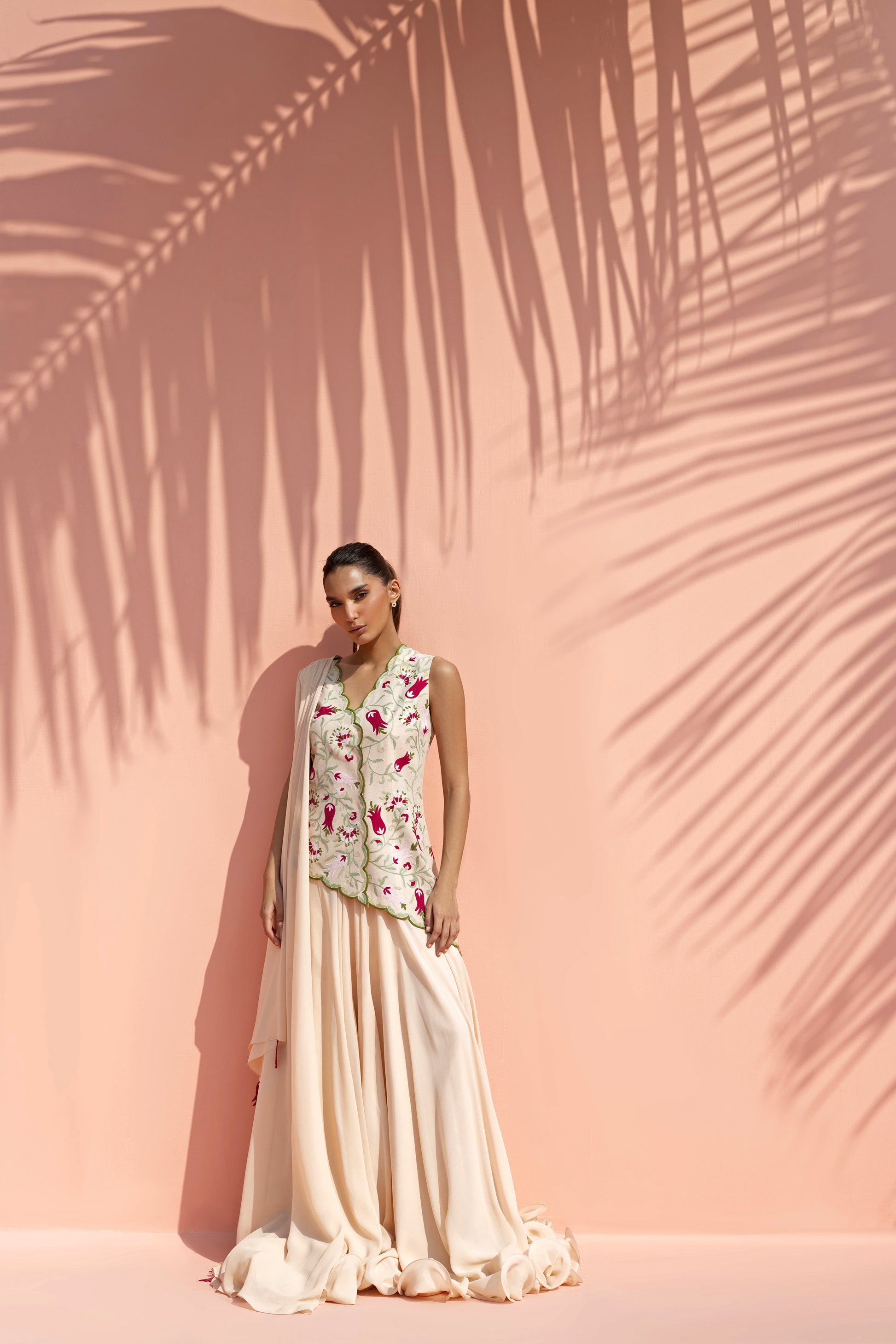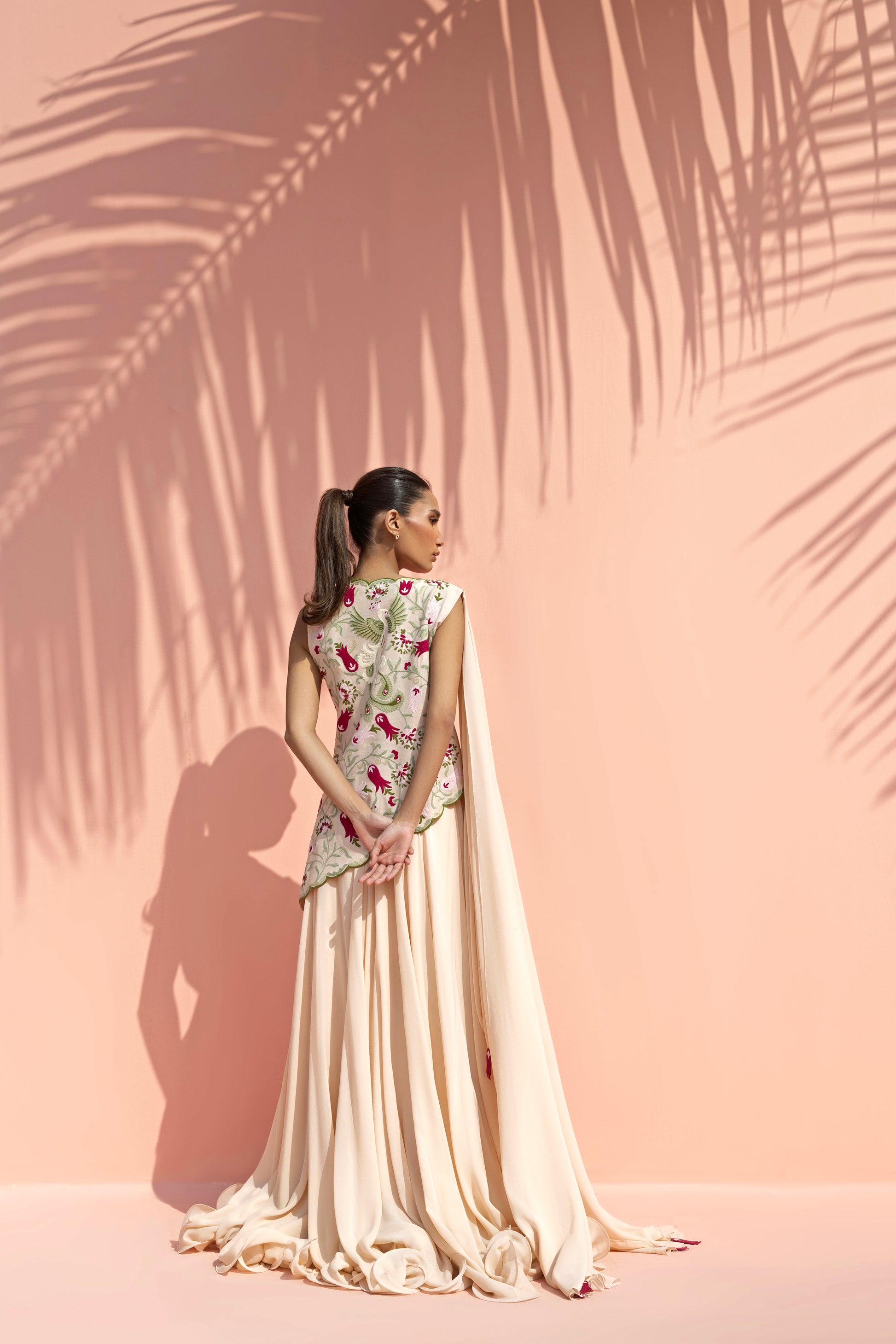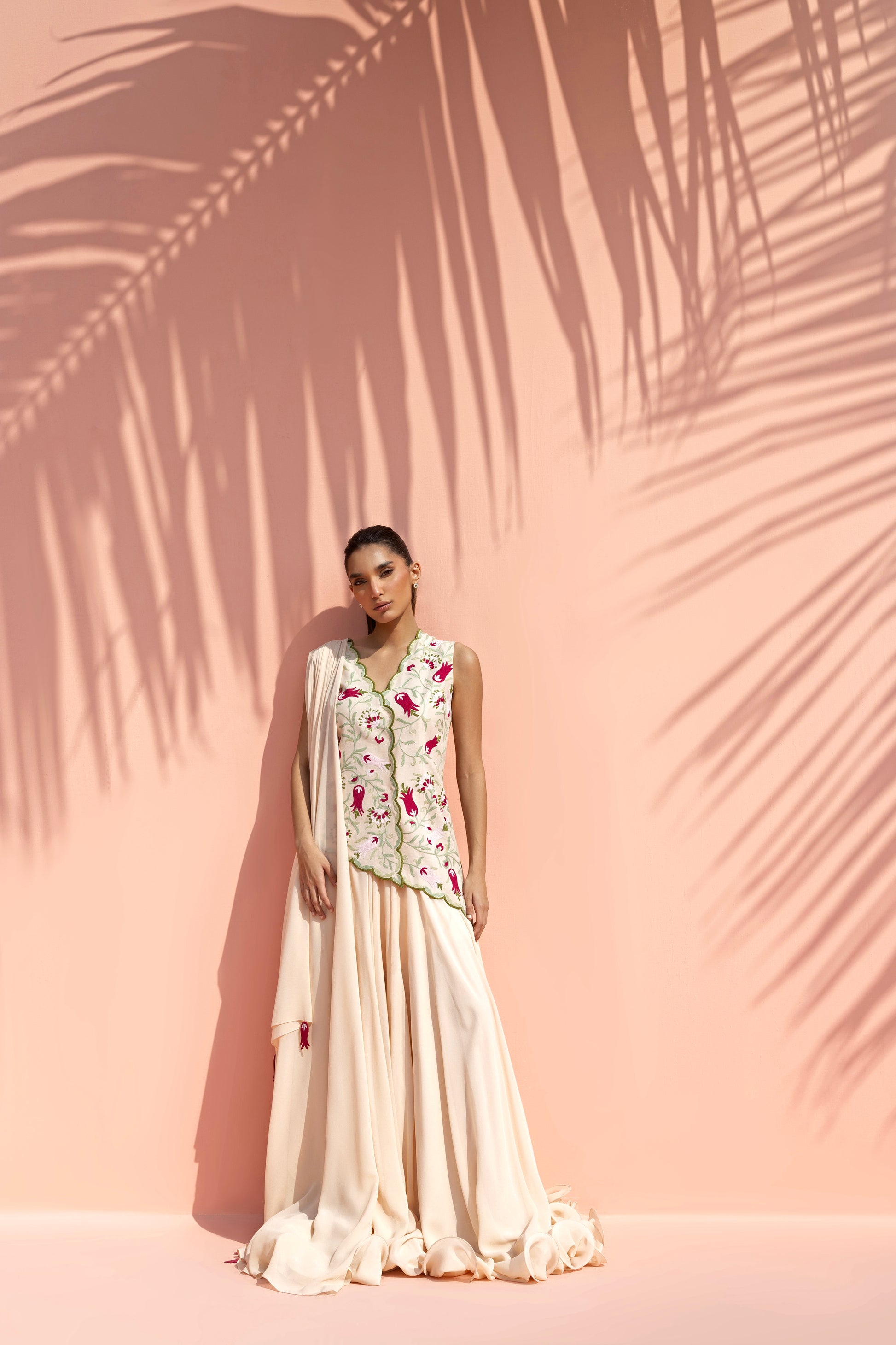 A soft interplay of structure and fluidity defines this look, anchored in a faded peach tone with vibrant accents of crimson and sage. The sleeveless khaddi corduroy top features a tailored, fitted silhouette with intricate aari embroidery, while scalloped edges trace the neckline and hem and stylised tulip and vine motifs create a richly detailed surface. It is paired with a voluminous draped skirt in fluid georgette, falling into soft, sweeping folds, while an attached pre draped dupatta in a matching tone adds a regal finish.