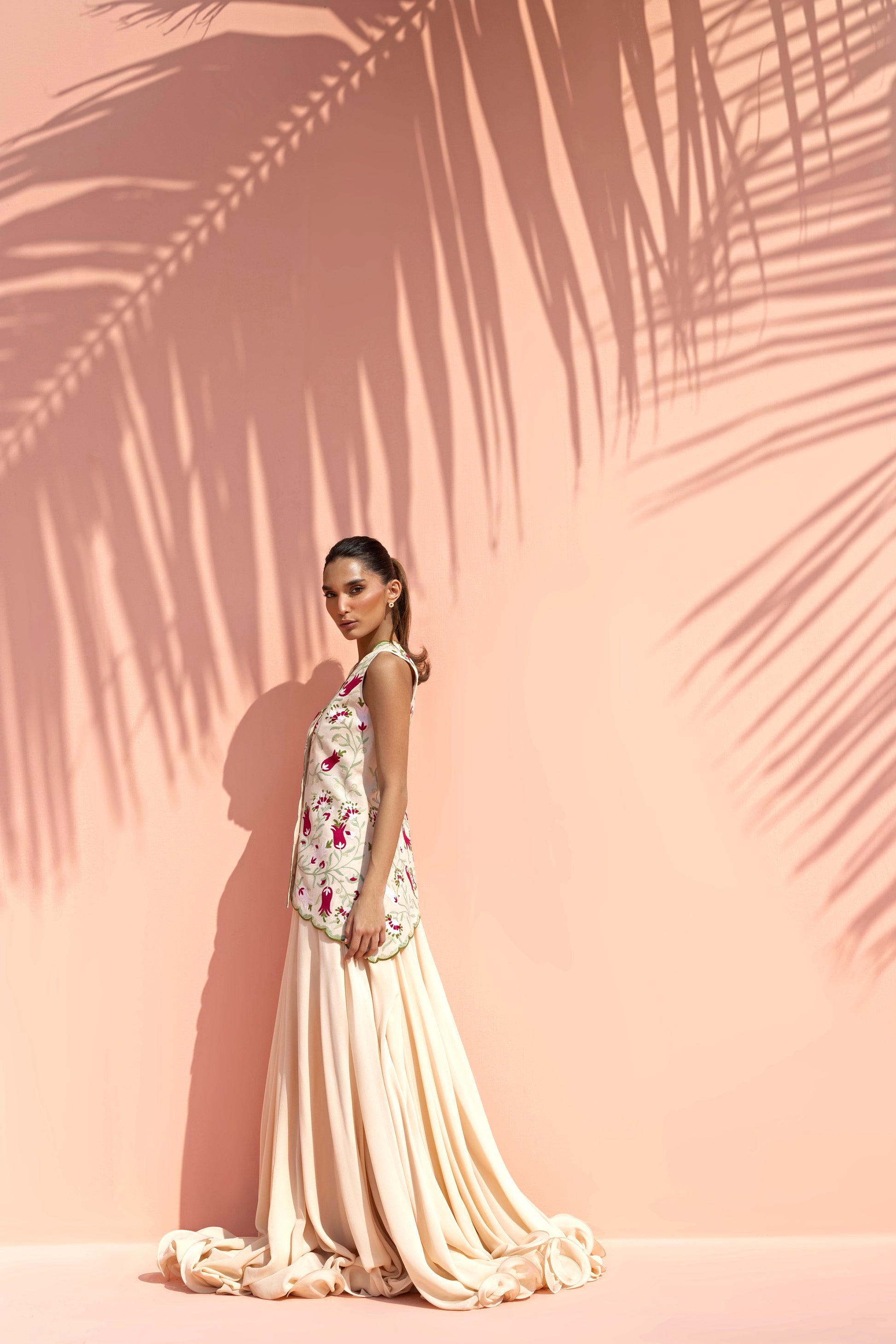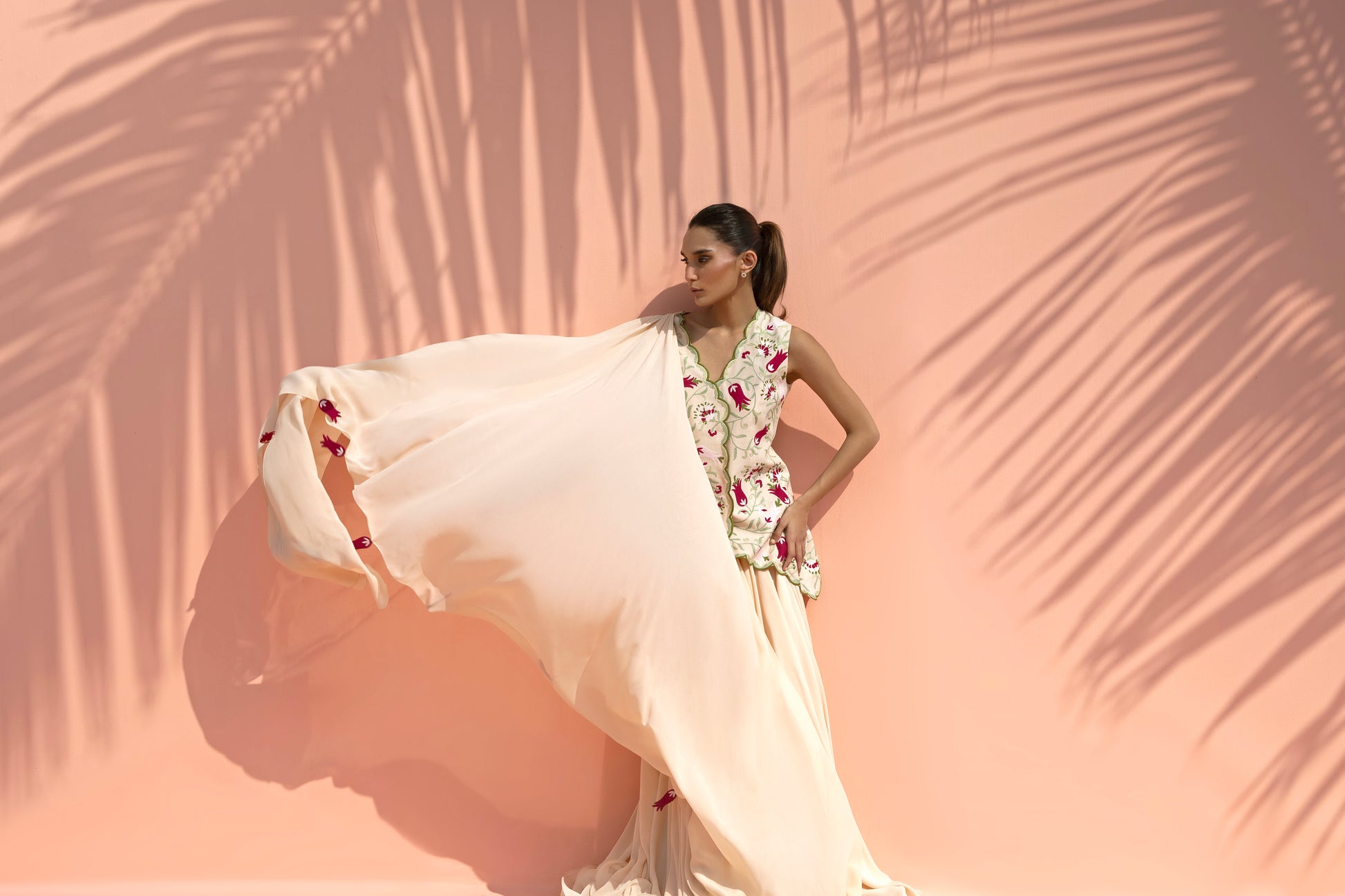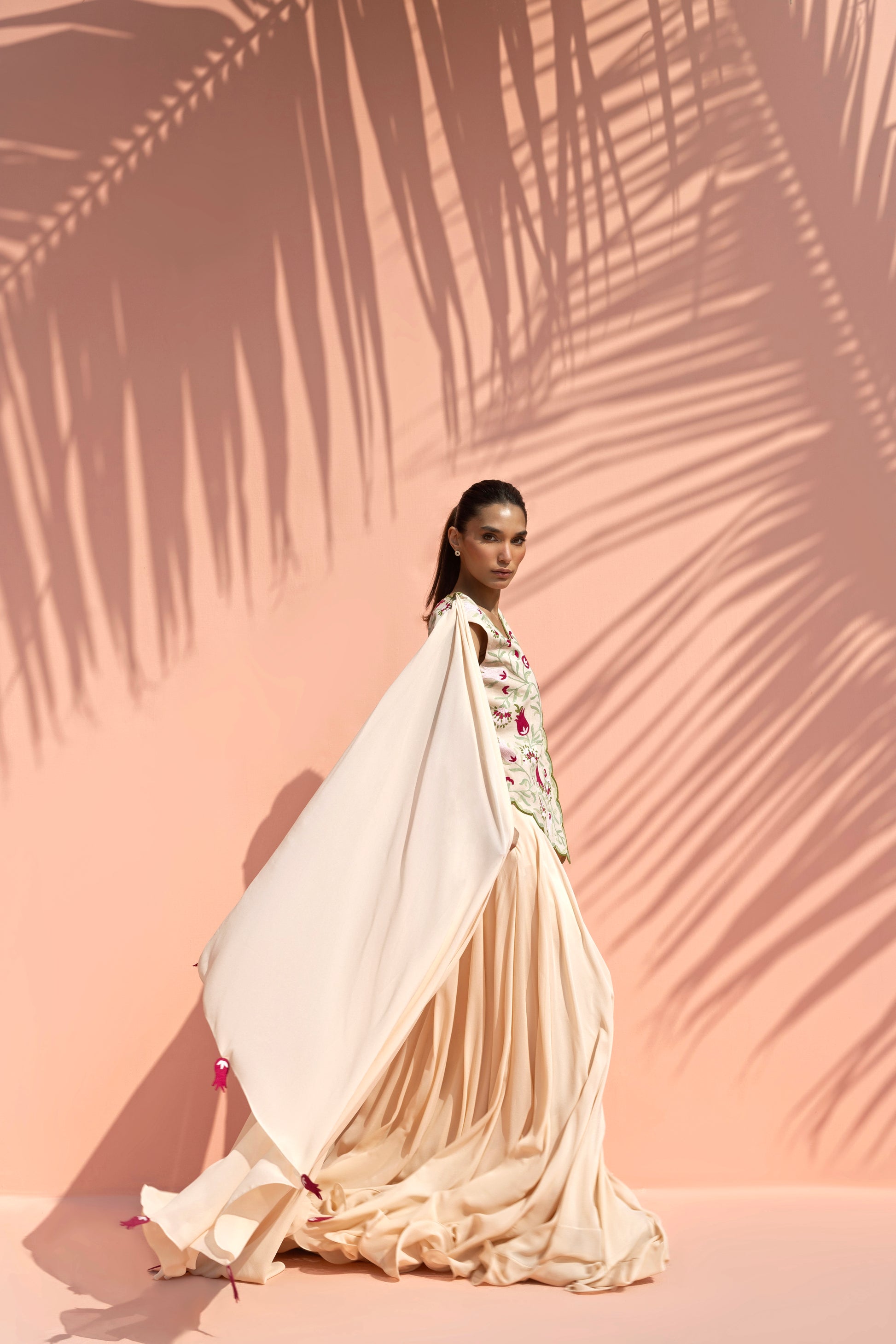 A soft interplay of structure and fluidity defines this look, anchored in a faded peach tone with vibrant accents of crimson and sage. The sleeveless khaddi corduroy top features a tailored, fitted silhouette with intricate aari embroidery, while scalloped edges trace the neckline and hem and stylised tulip and vine motifs create a richly detailed surface. It is paired with a voluminous draped skirt in fluid georgette, falling into soft, sweeping folds, while an attached pre draped dupatta in a matching tone adds a regal finish.