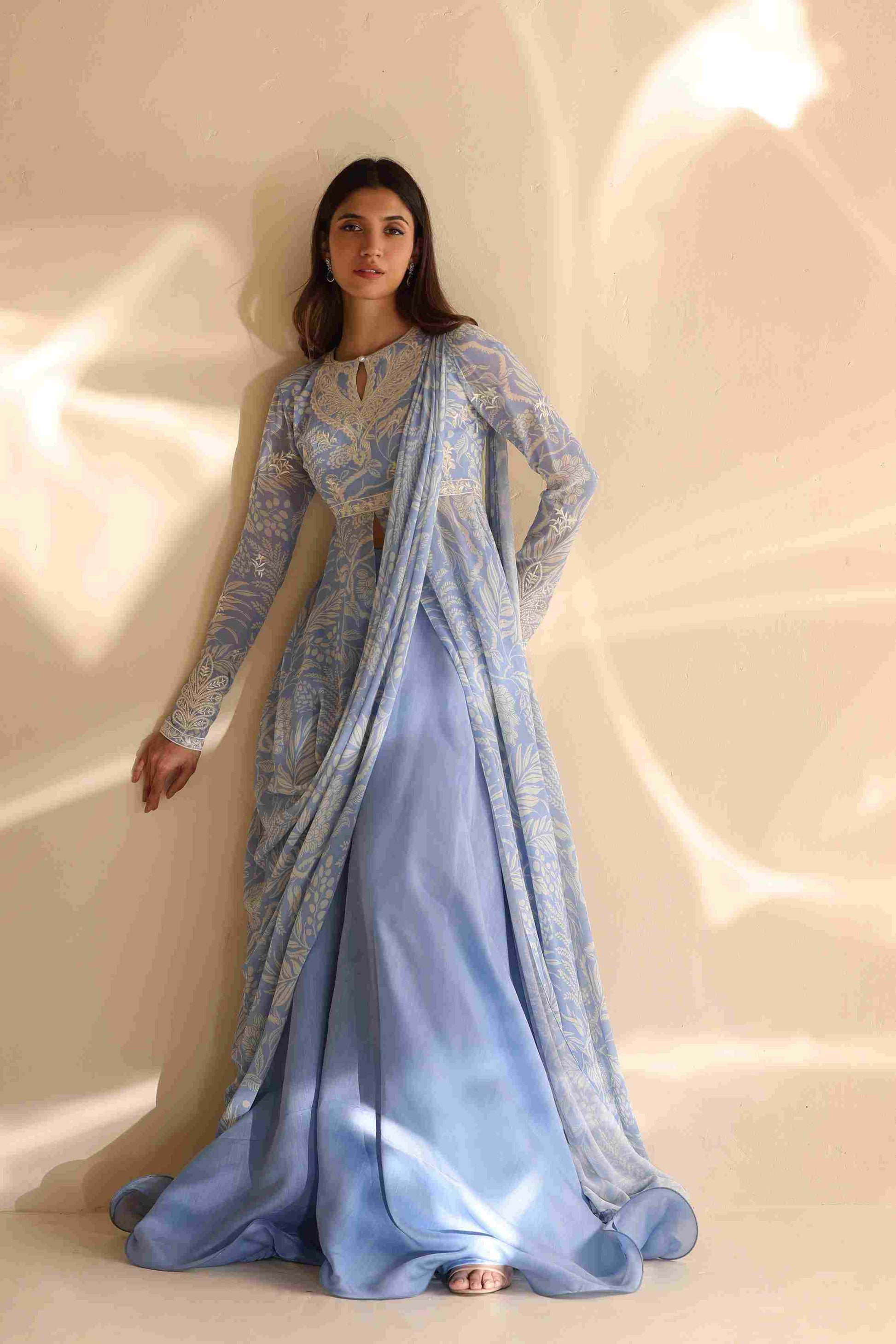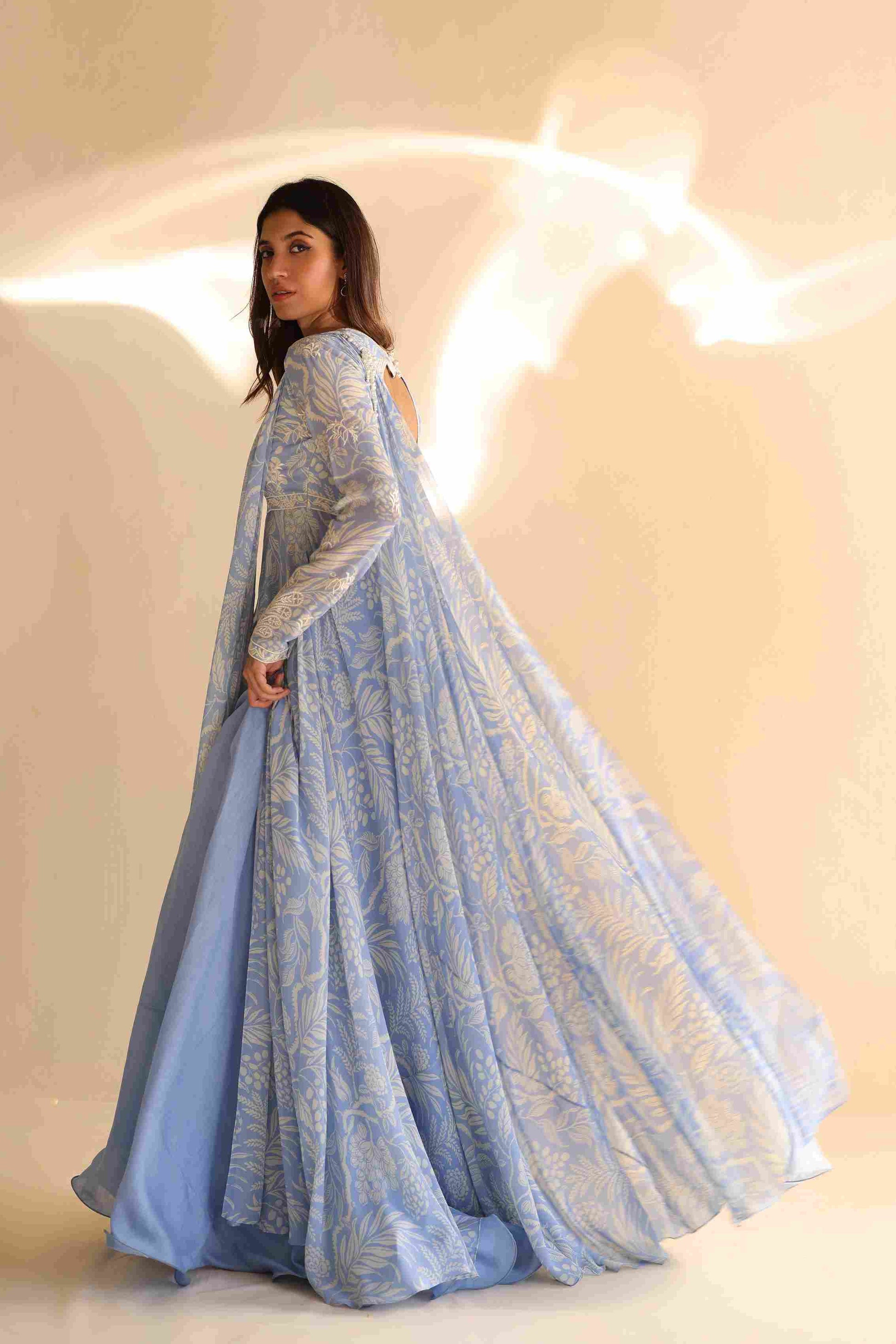 An attached draped dupatta elevates this front open, periwinkle hued chinoiserie printed peshwas, cut from georgette. The keyhole neckline and slim fit long sleeves are embroidered with ivory toned symmetrical floral vines, extending onto the statement heart shaped cutout at the back. The draped dupatta seamlessly melds into the voluminous flare, creating a poetic interplay of structure and fluidity.