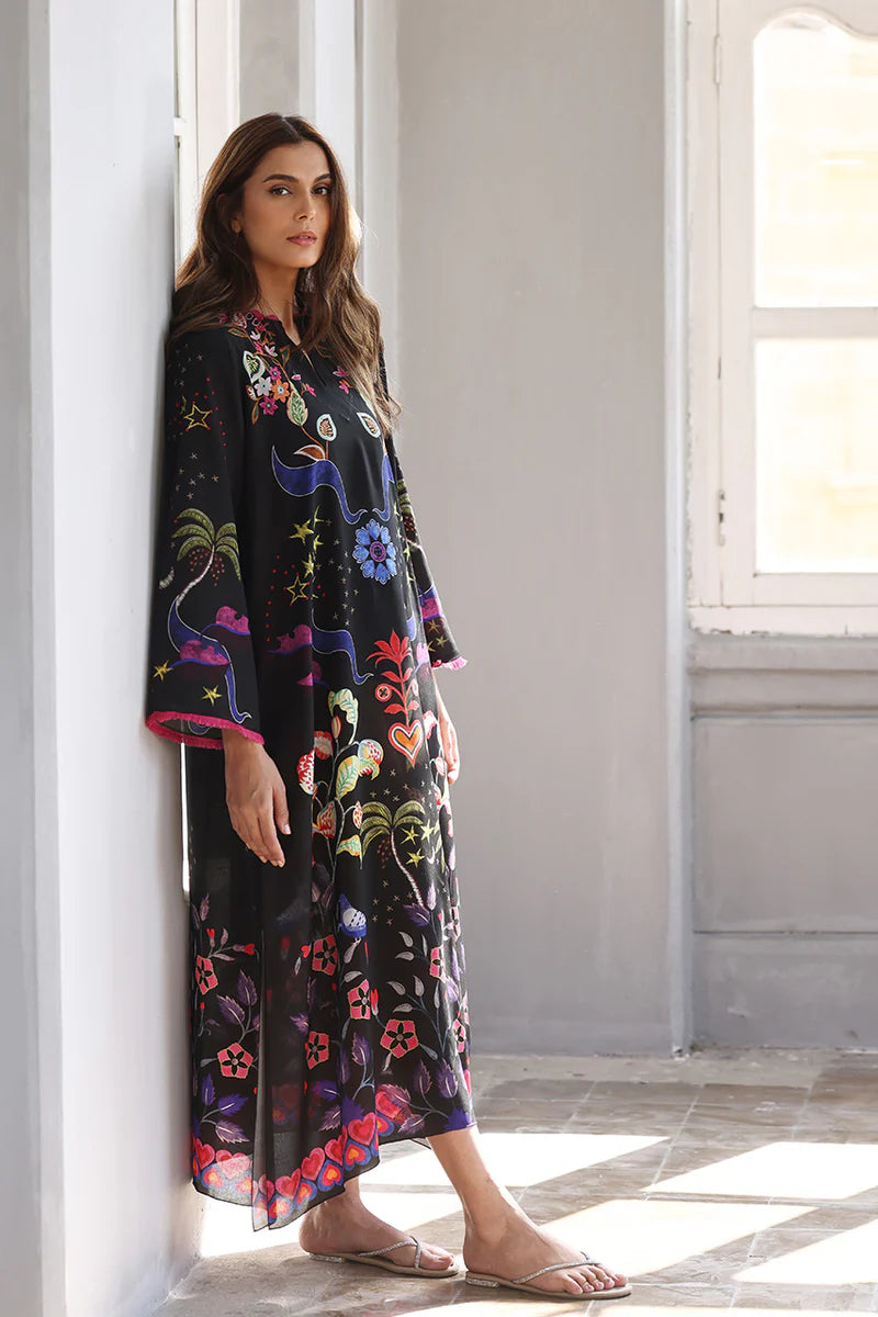 A playful ebony crepe kaftan showcases a whimsical multi-hued print with floral and heart patterns. The relaxed silhouette is adorned with scarlet detailing the sleeves.