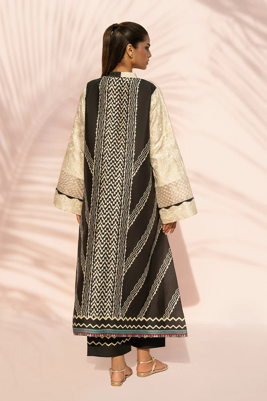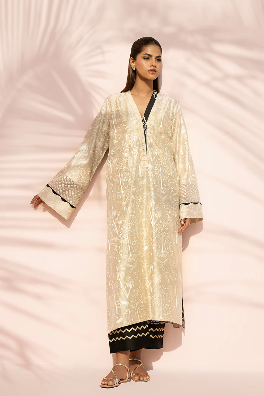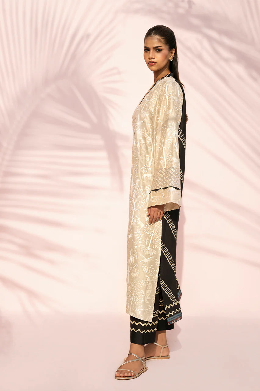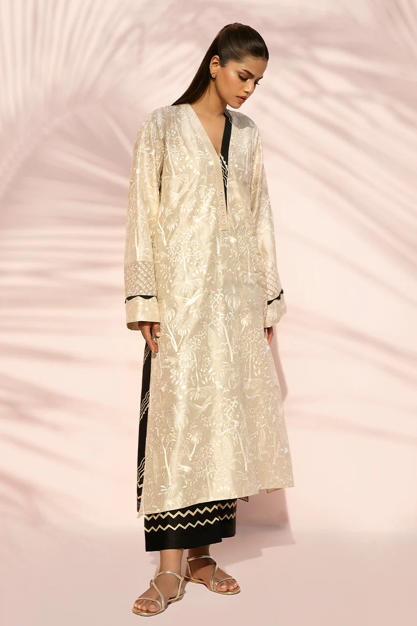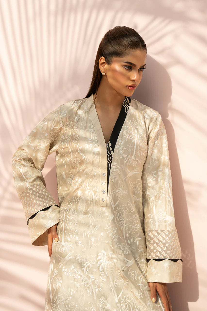 This luminescent tan ensemble carries an ethereal glow, featuring an A line pure rawsilk shirt adorned with tonal embroidery depicting a lush, whimsical forest scene across the front. The back reveals a striking ebony hued geometric print, introducing a contemporary contrast. Framed by a V neckline, the design is further elevated with wide statement sleeves detailed with delicate organza panels. It is paired with ebony toned culottes finished with printed detailing, grounding the look with a balanced, modern finish.