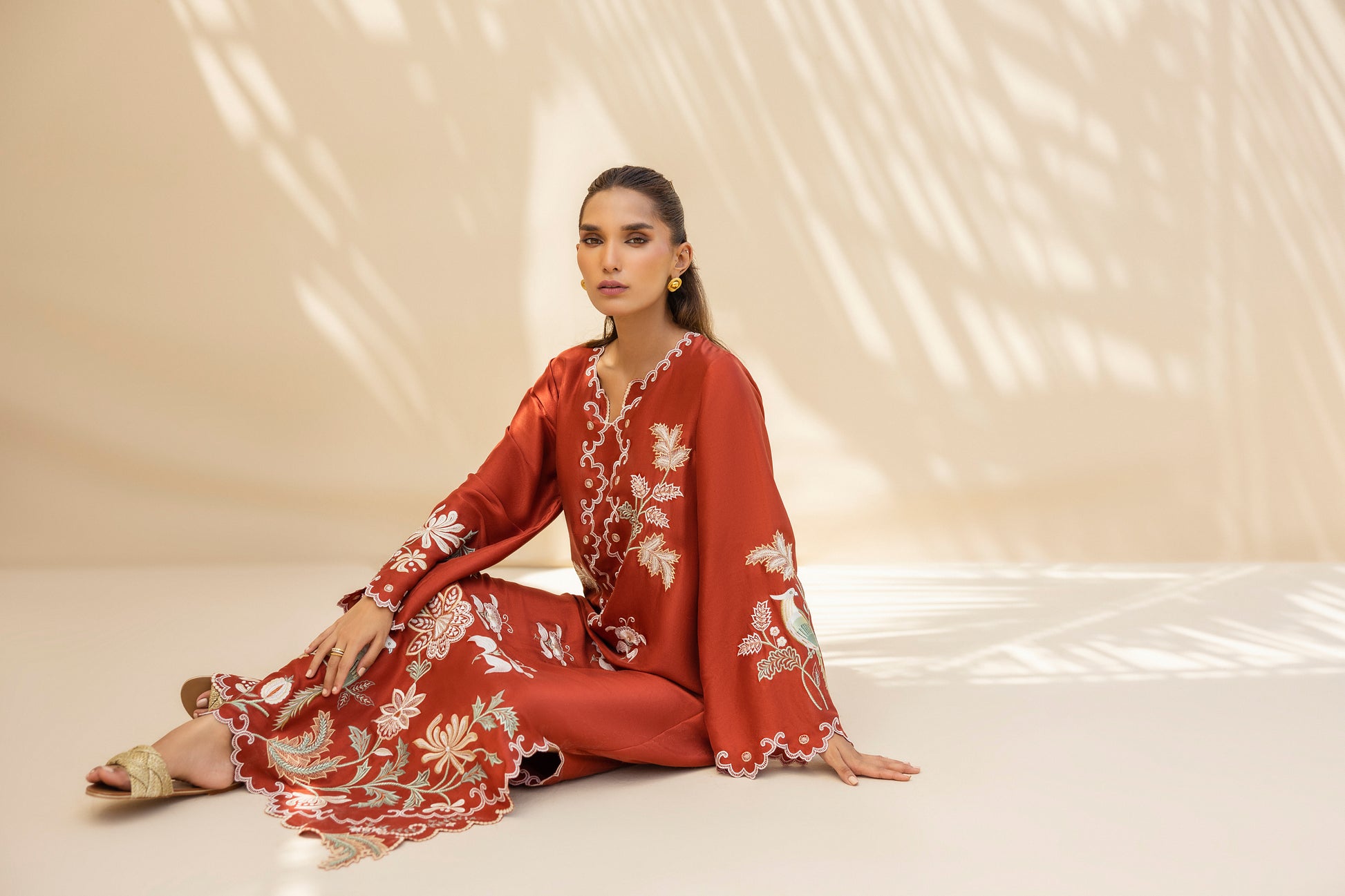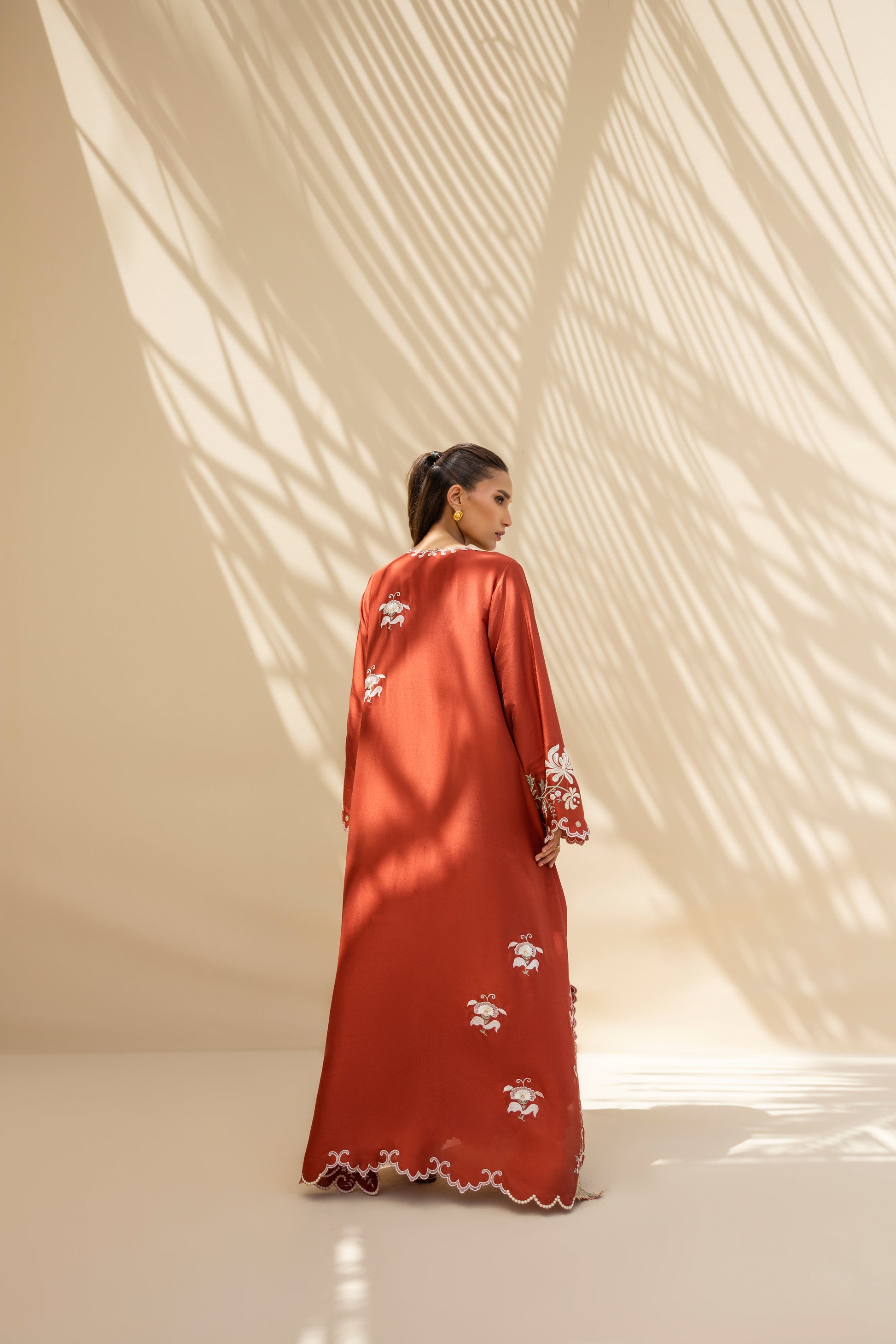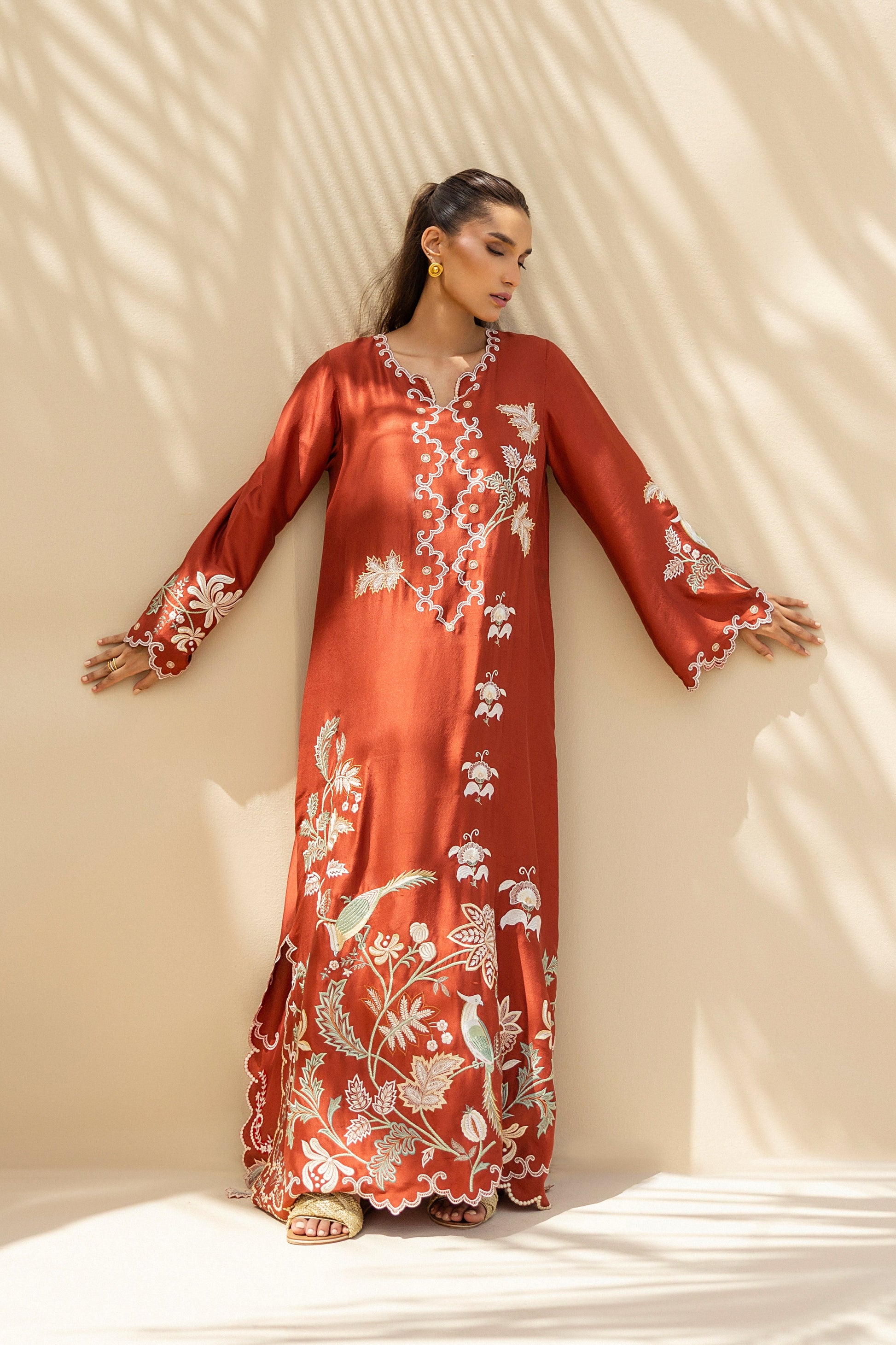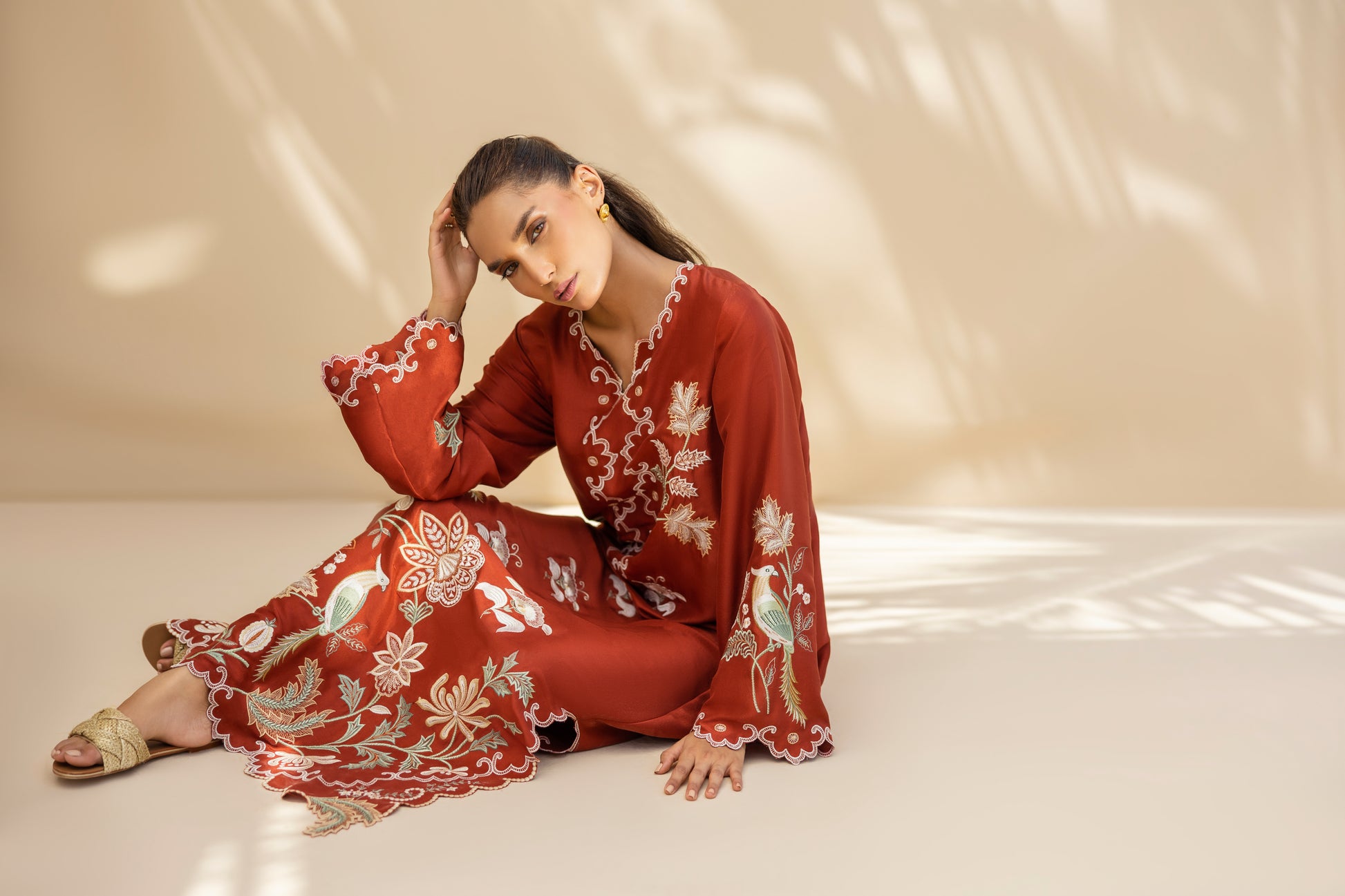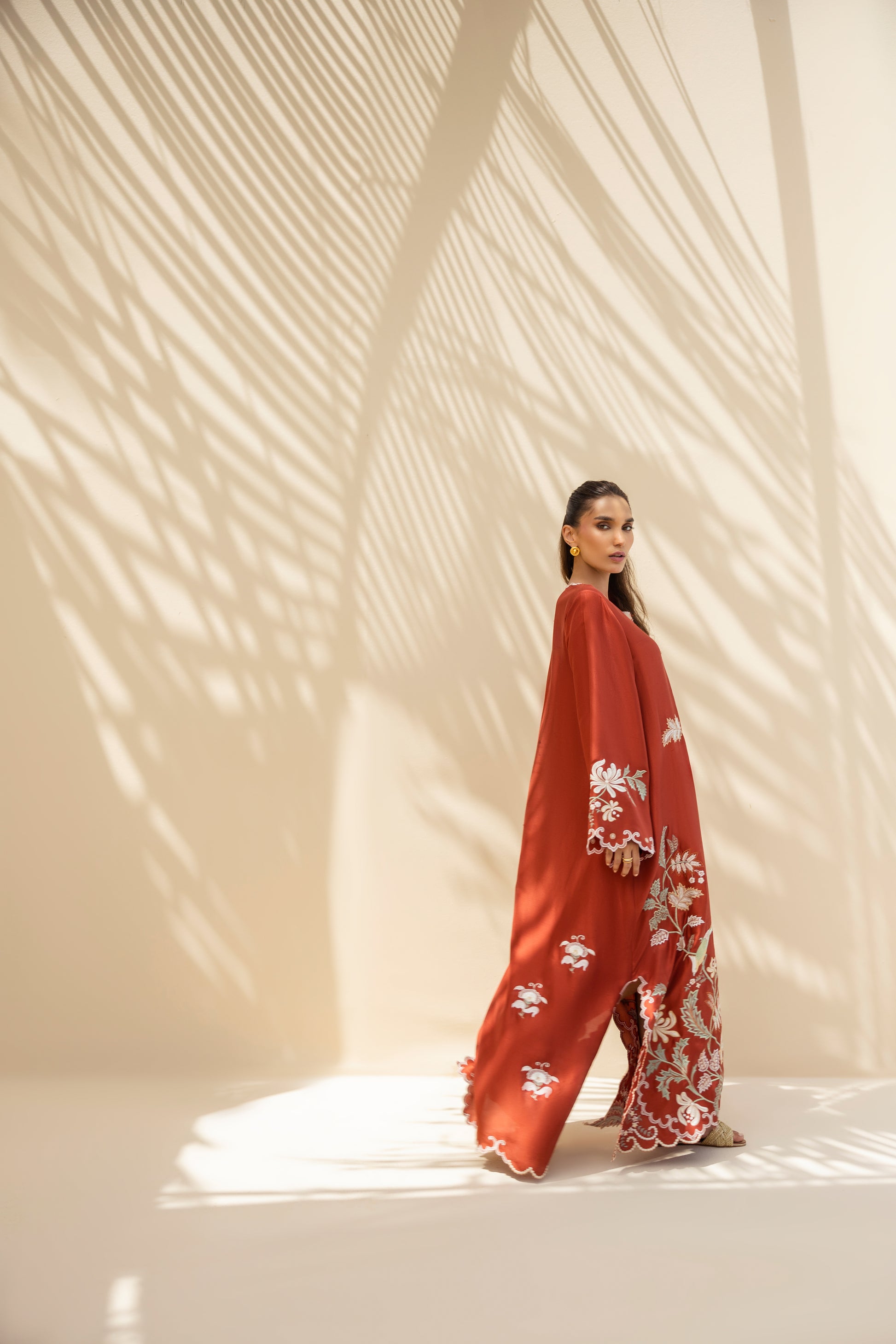 Crafted in deep chestnut rawsilk, this flowing silhouette is adorned with a botanical tapestry of ivory and sage embroidery that decorates the scalloped neckline, hem and sleeves. The interplay of embroidered motifs, scalloped edges and a soft drape lends the ensemble an air of refined elegance.